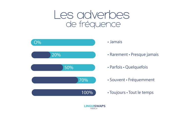 Voici la liste des adverbes de fréquence les plus utilisés, classés du moins fréquent au plus fréquent.